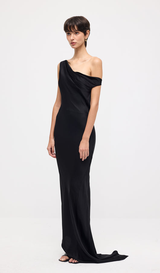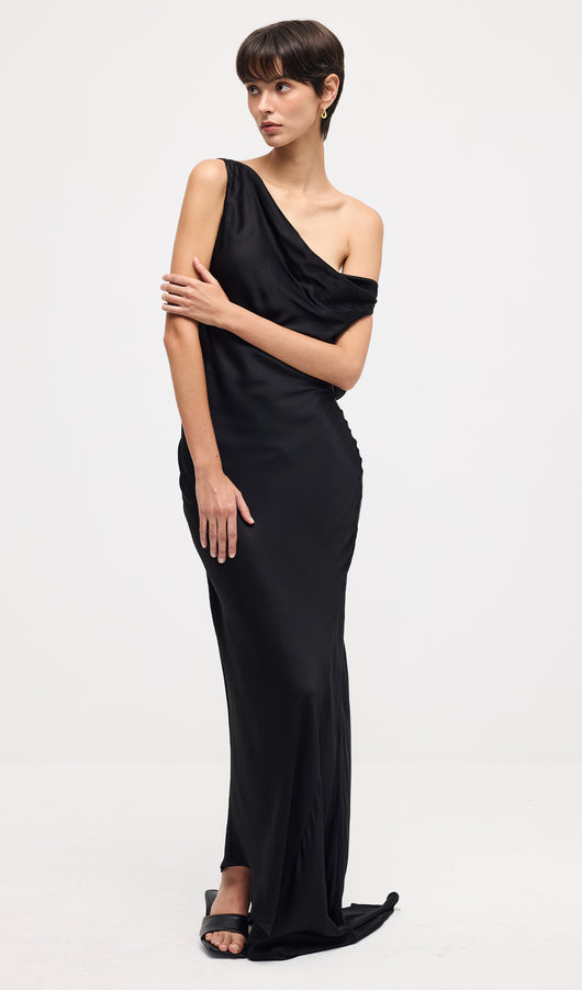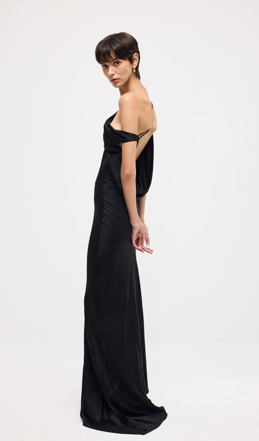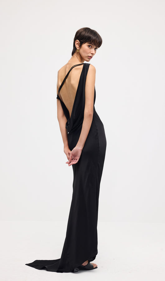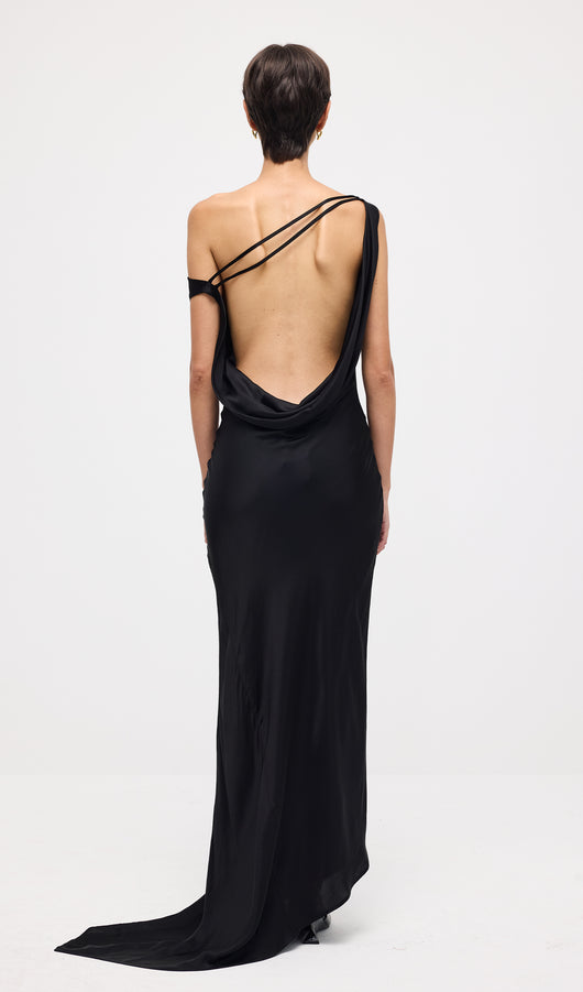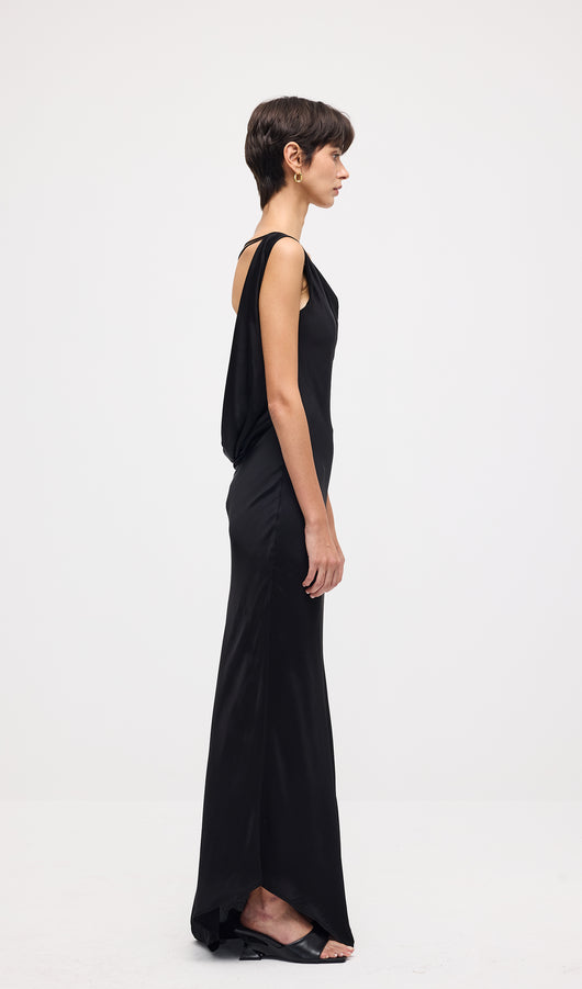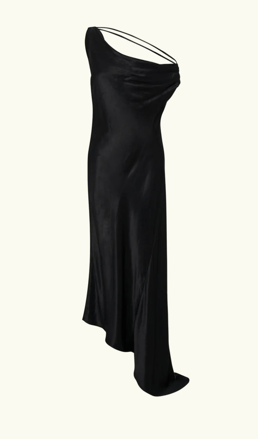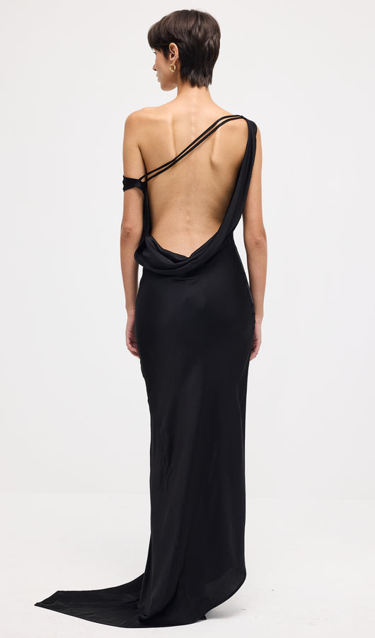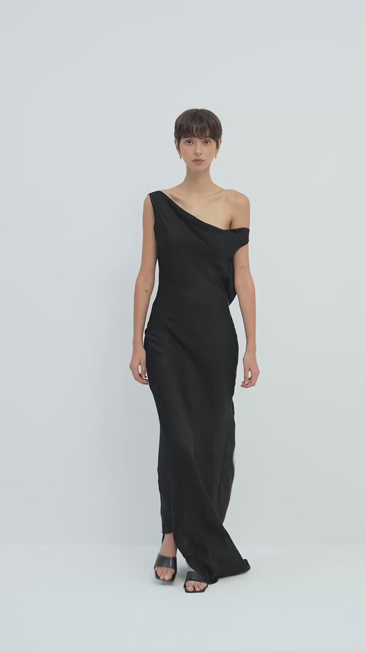 This style is designed to be a relaxed fit, please size down for a more fitted look.This is a Slip Maxi Dress with a low, open back, a slight cowl detail for the front neckline, and a loose, flowing hem. The front neckline dips into a slanted arrangement, with one shoulder strap up for a sleeveless look and the other down in an off-shoulder style. The asymmetrical hem is much the same, with one part gathered above the ankle and the other hitting the ground. Two thin fabric straps run across the back, adding extra detail to the low, back neckline.