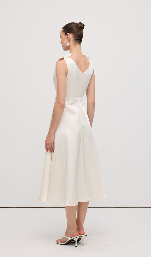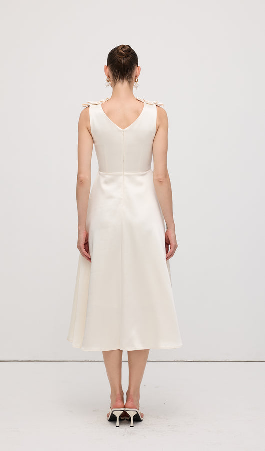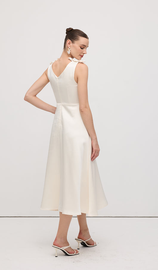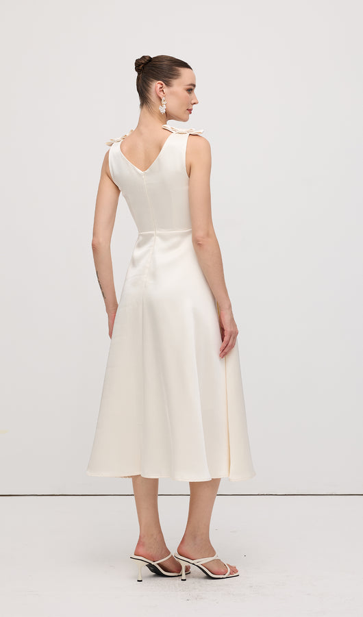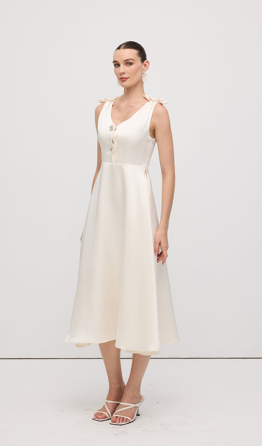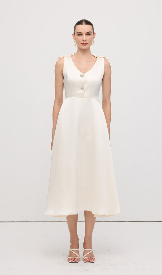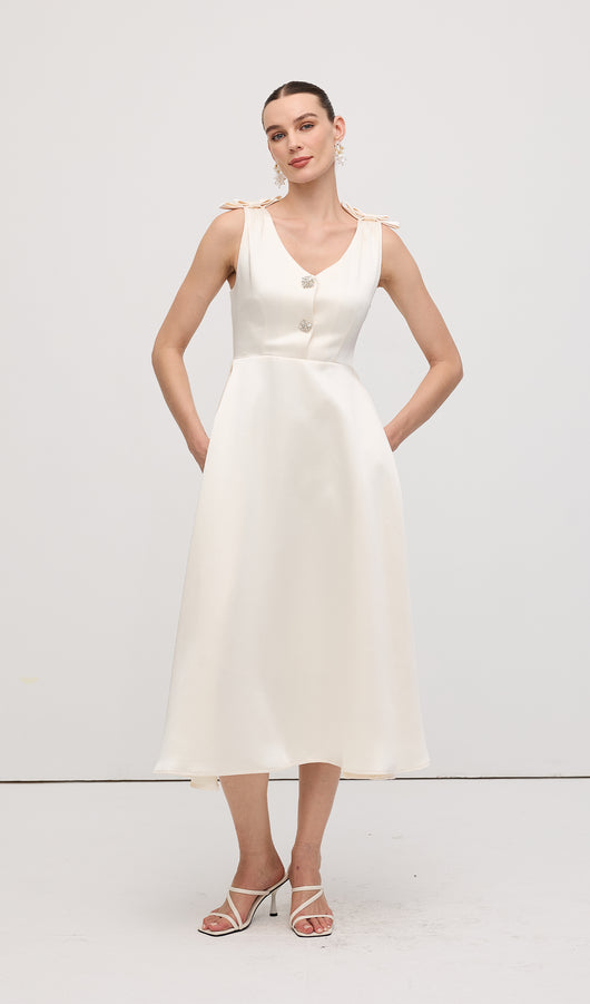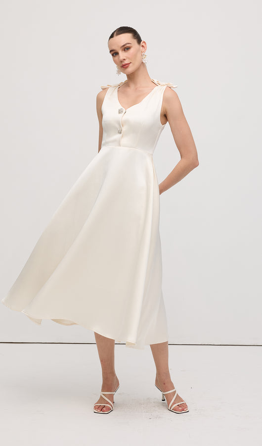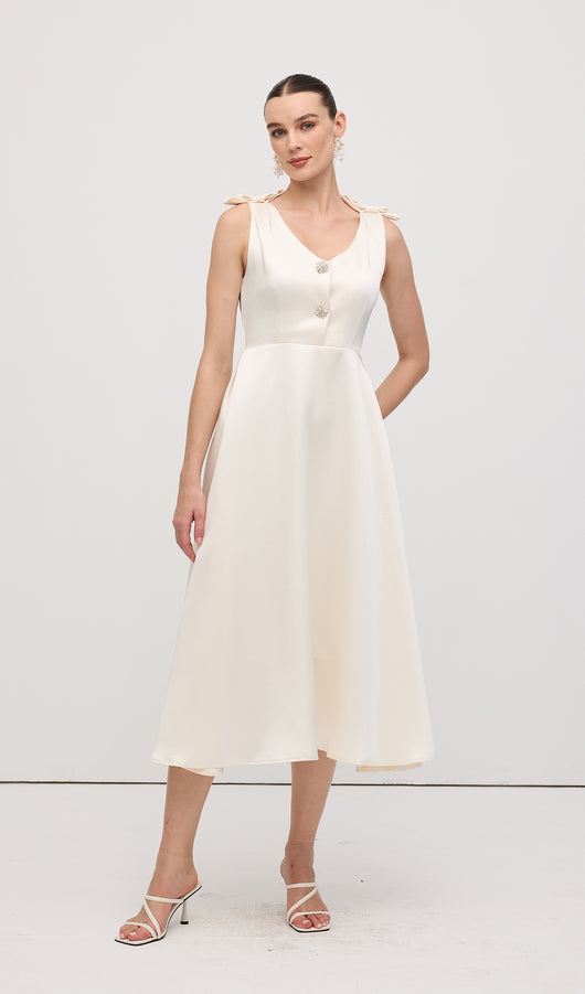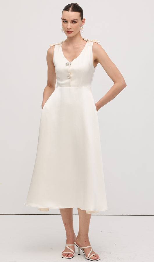 Shine brighter in the Bow Shoulder Zircon Button Midi Dress with its timeless charm and modern elegance. This dress features a flattering V-neckline and a flowy silhouette that moves gracefully with you. The bows on the shoulders add a whimsical touch, while the zircon button embellishments provide a sparkling finish. Practical side pockets and padded cups ensure both comfort and style.