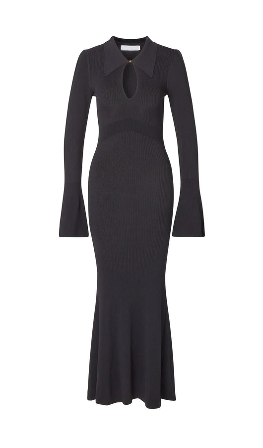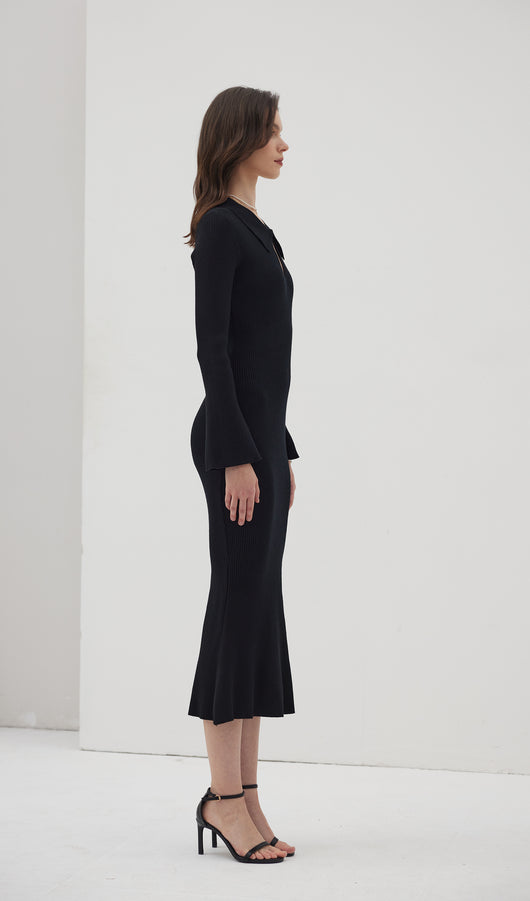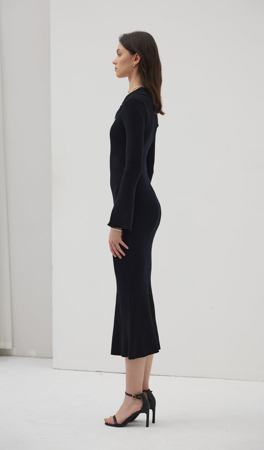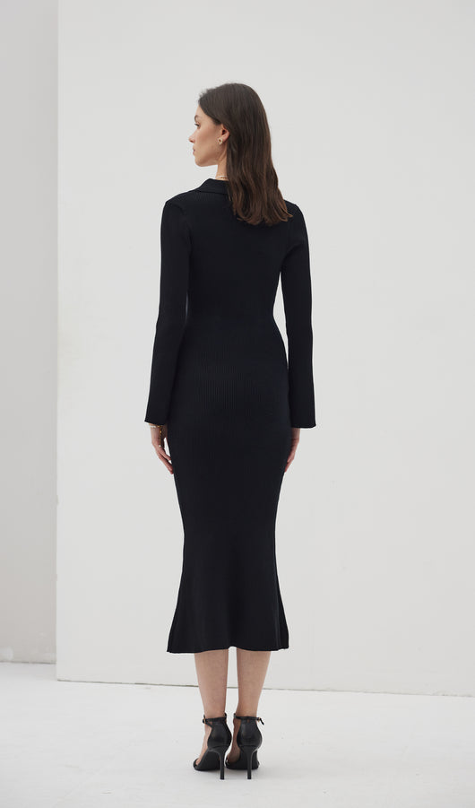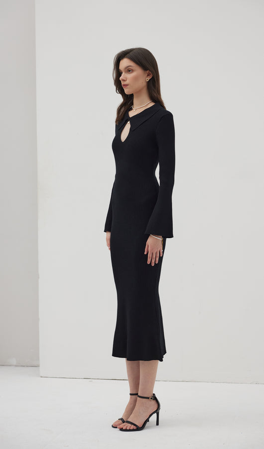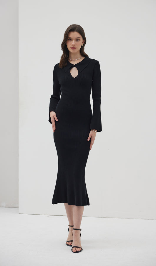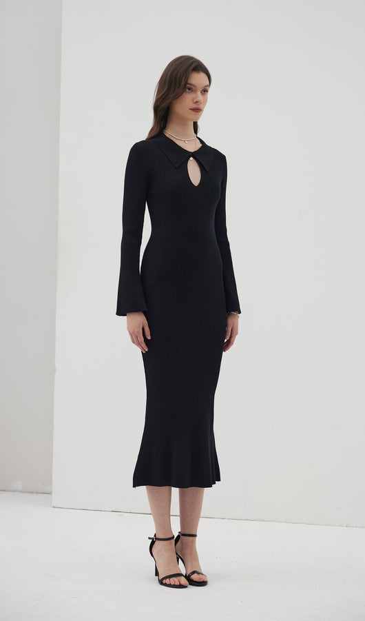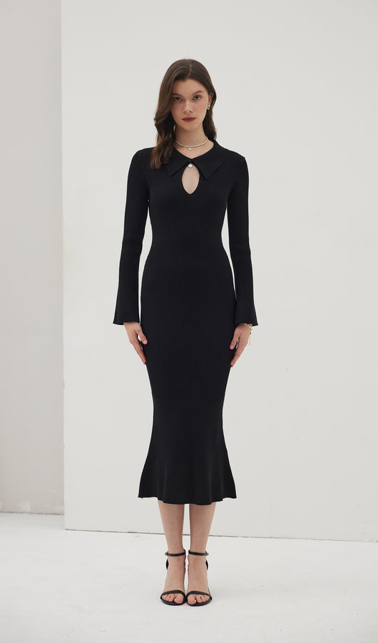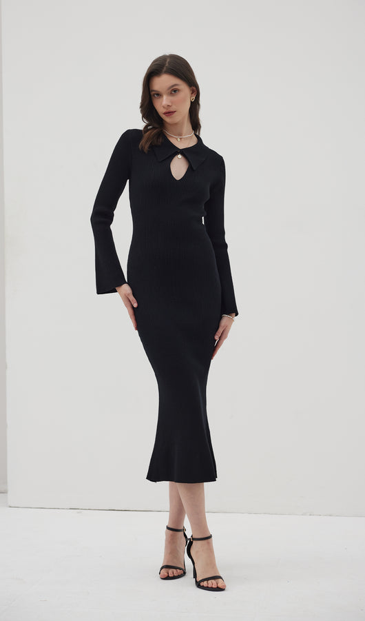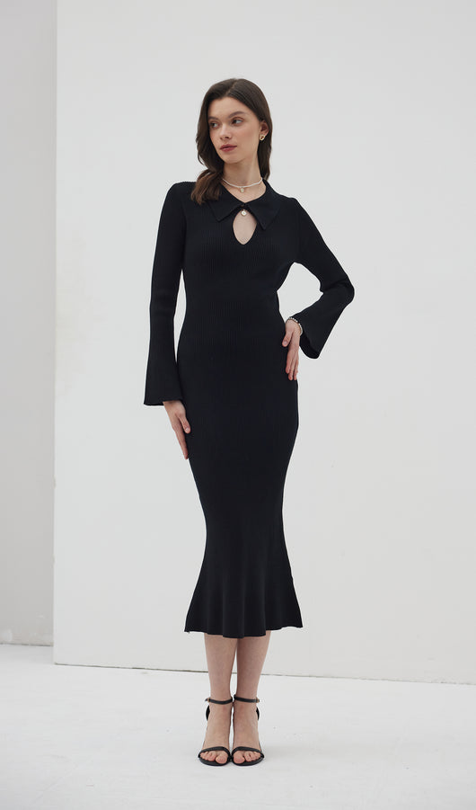 The dress is a thin knitted maxi-length dress. Featuring a collar that closes with a small, discreet button at the top, creating a cut-out look at the chest area. With decorative seams below the chest and a flared bottom, the dress beautifully accentuates the figure. The dress also has full-length sleeves with wide cuffs.