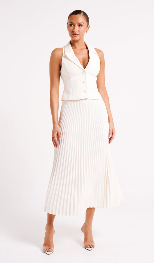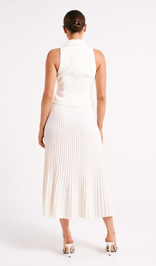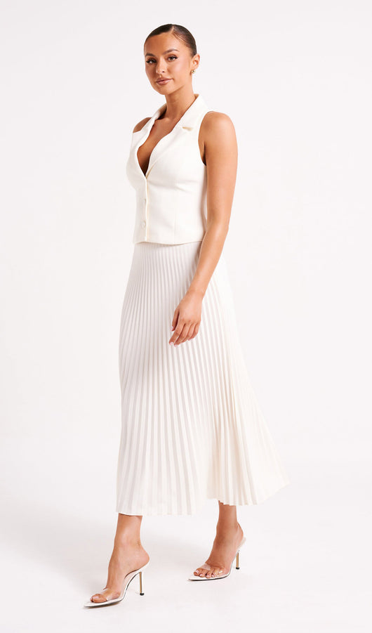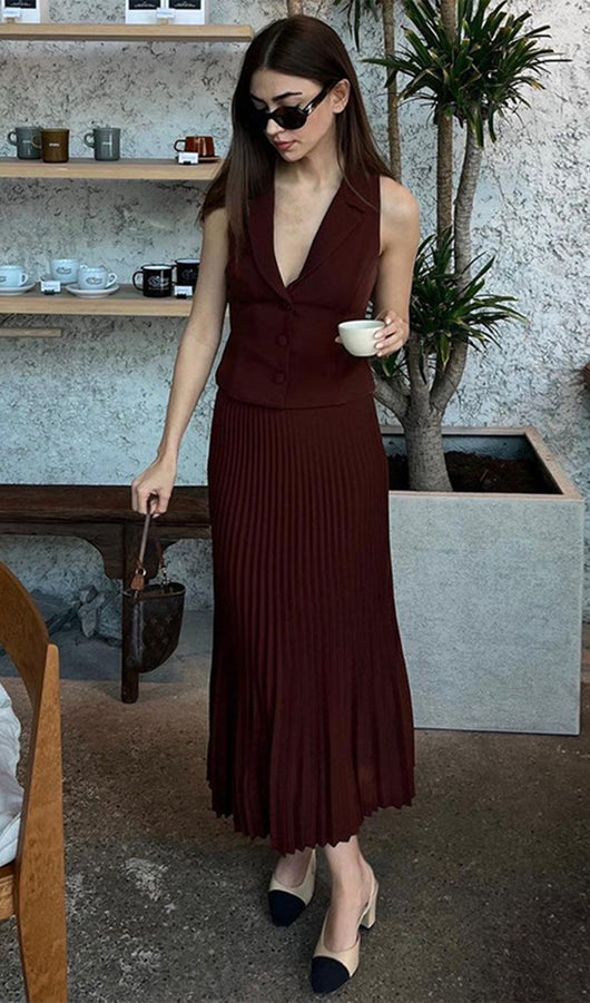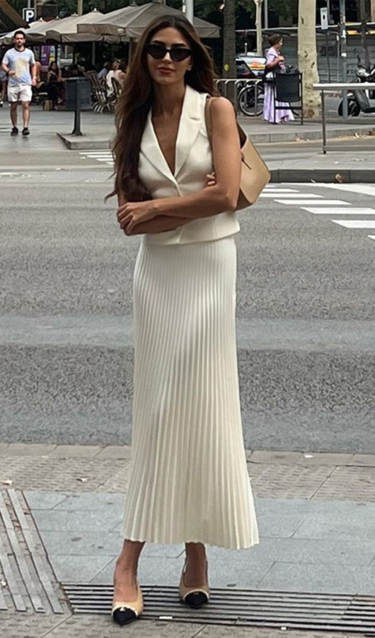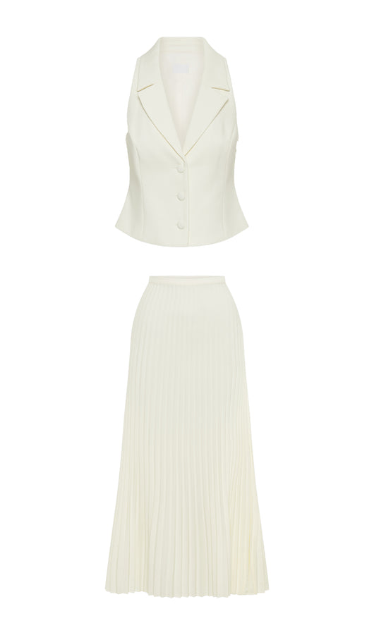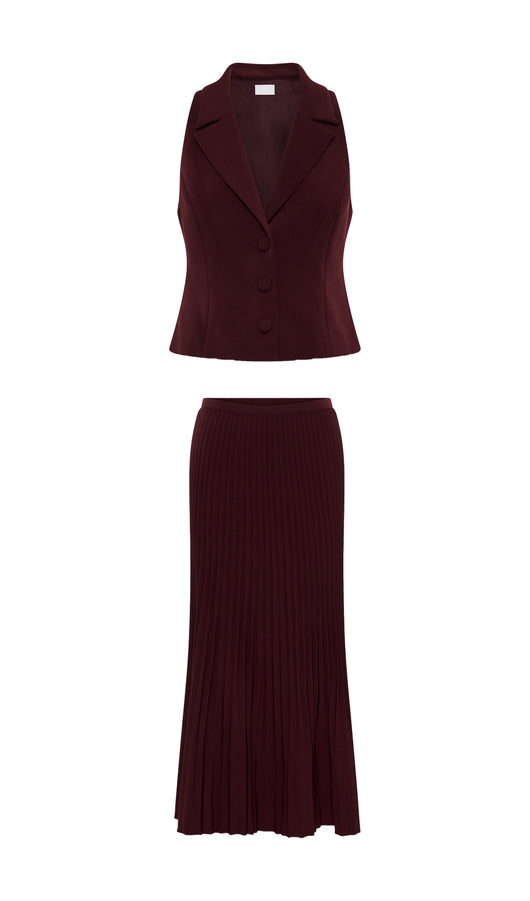 Top is a sleeveless, single-breasted suiting vest with a deep V-neckline and functional front buttons. The lapel collar and longline bodice add structure to the soft, comfortable fabrication, seamlessly blending form and function. The silhouette is a suiting classic–clean lines, smooth edges, and subtle details.