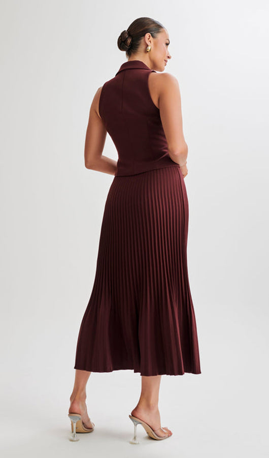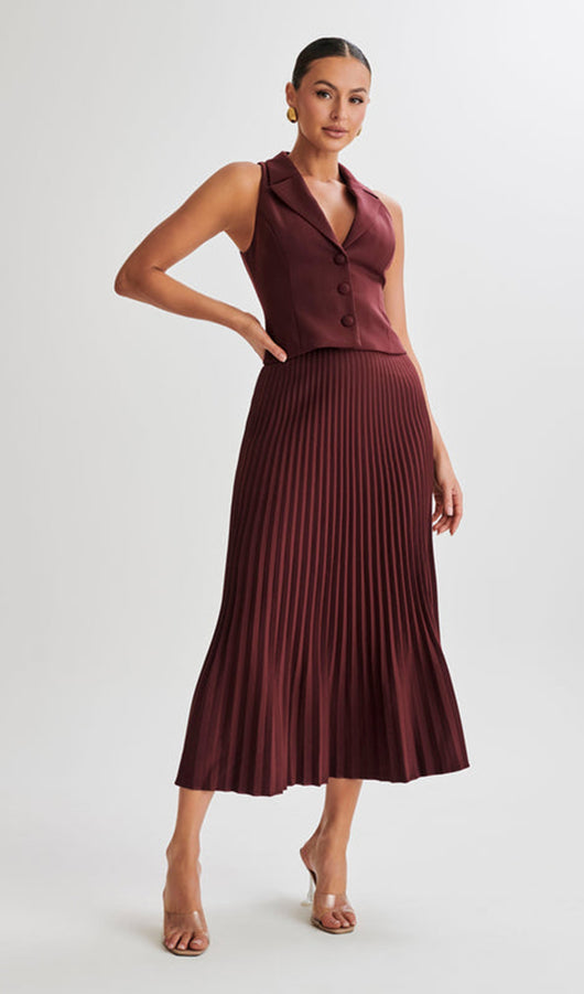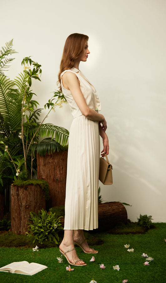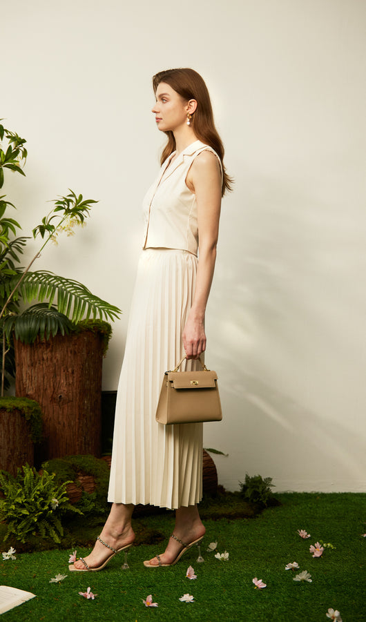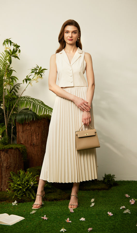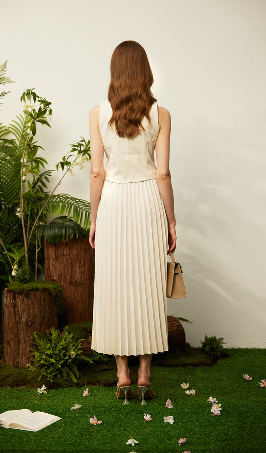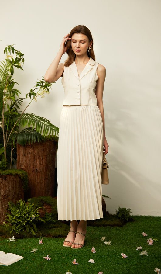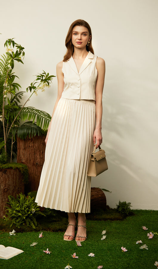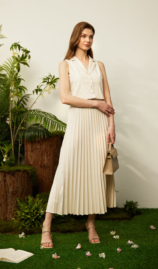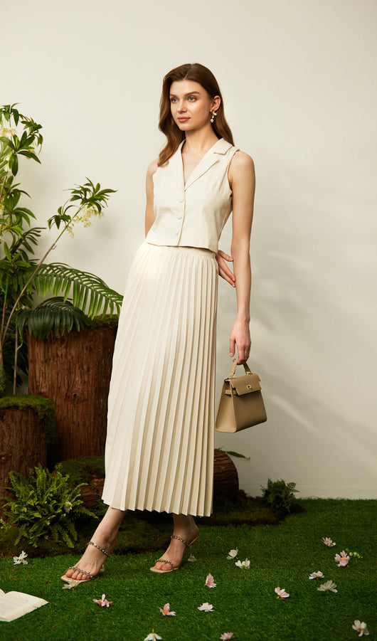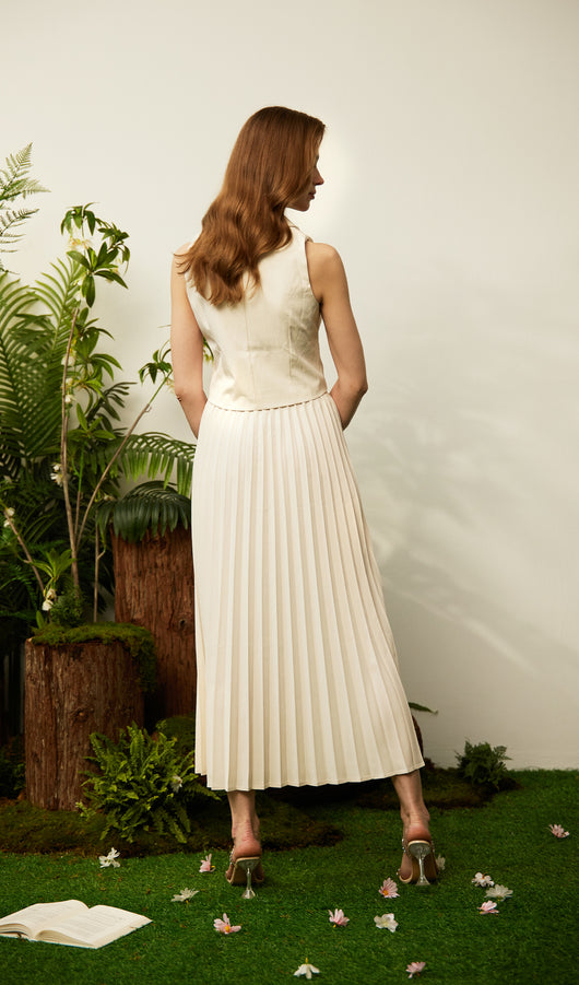 The skirt with an invisible side zipper and waist-to-hem pleats. Fresh and versatile, its polyester-and-elastane fabrication allows it to look loose and flowy without losing its structure. Small details like the fitted waist and pleated hem for visual appeal but at a timeless length.
