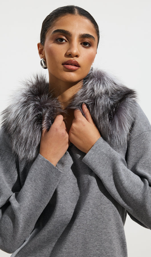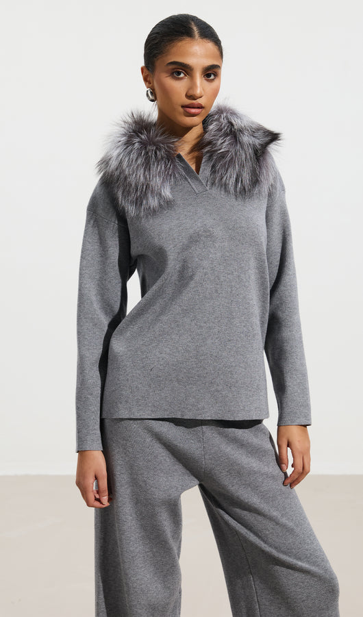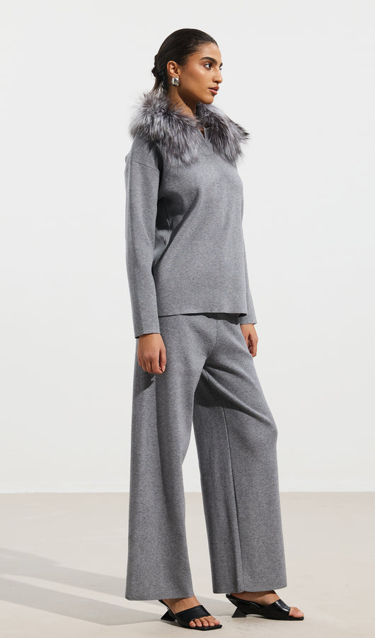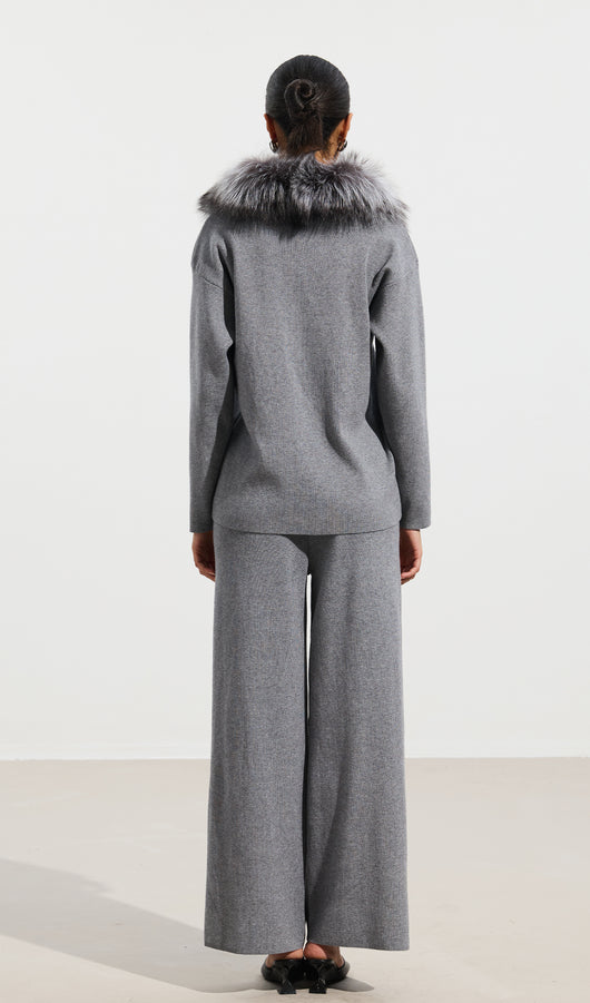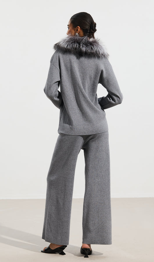 Sweater With Fox Trimming & Knitted Pants Set Grey