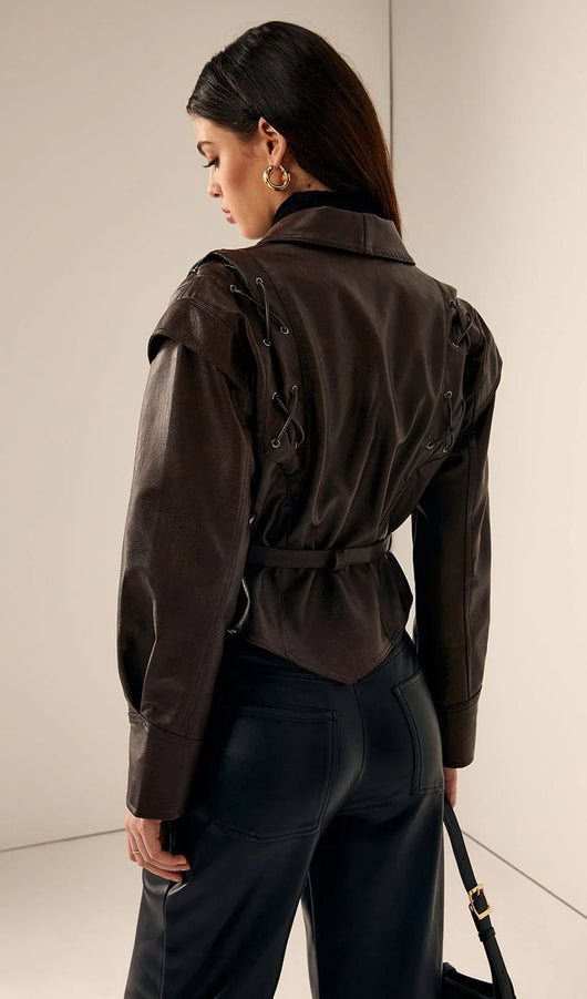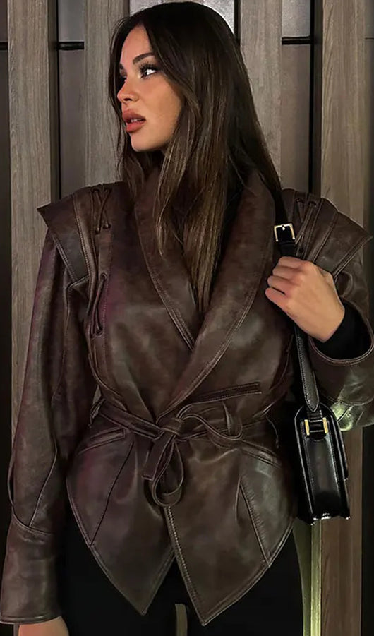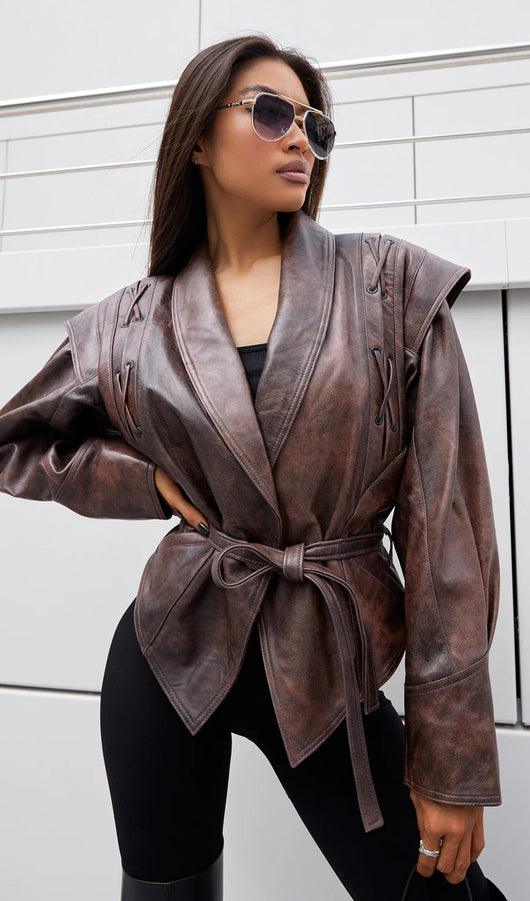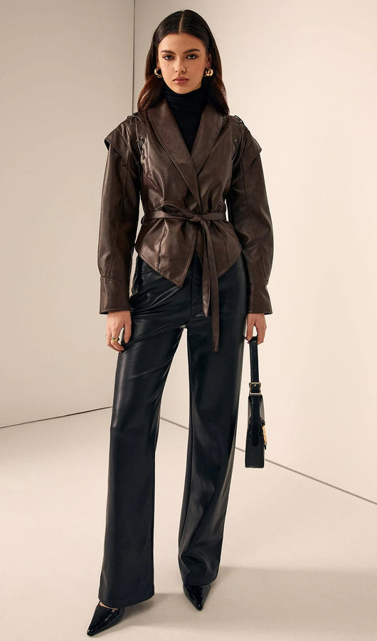 Strike the perfect balance between edgy and elegant with the Tie-Waist Faux Leather Jacket, designed to elevate any ensemble. Featuring soft faux leather with a sleek wrap-style front and adjustable waist tie, this jacket sculpts a flattering silhouette with bold confidence. Subtle lace-up shoulder details add a modern twist.