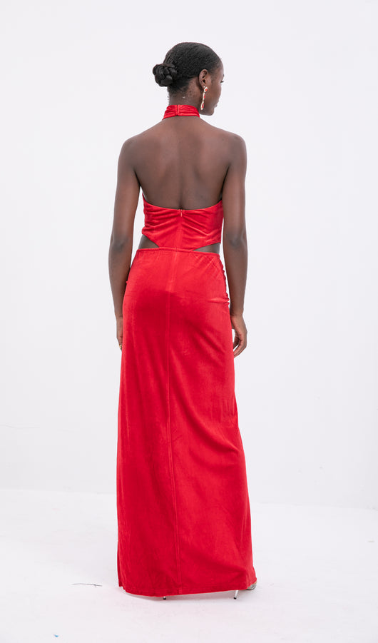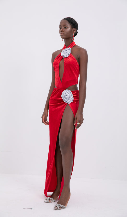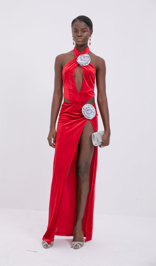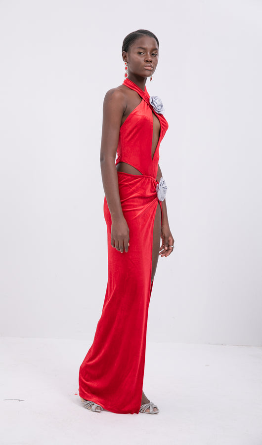 Introducing the Maxi Dress, a stunning piece in luxurious red. Its cutout front and oversized floral embellishments add an artistic touch to the waist and neckline. Elevate your style with this elegant and exclusive dress.