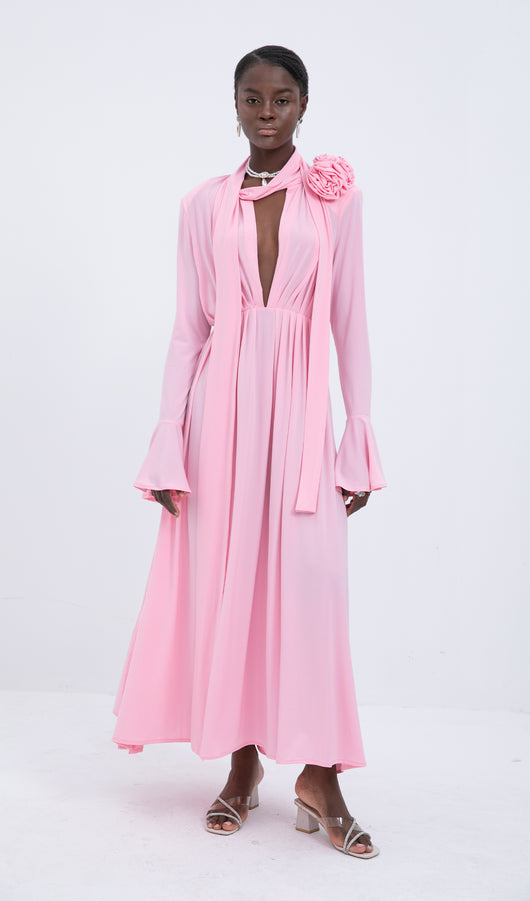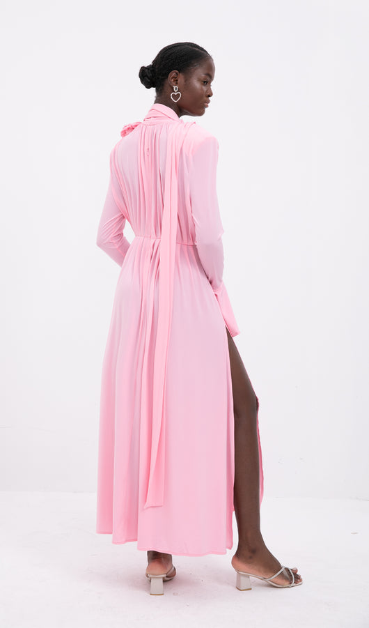 Trendy V-Neck Pleated Slit Maxi Dress-Pink