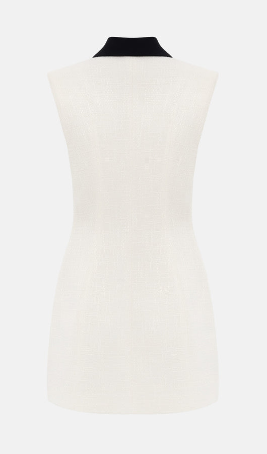 Elegant sleeveless mini dress with contrasting triangular collar and decorative pockets, with a playful A-silhouette skirt. It is made from dense tweed and fastens with large buttons at the front.