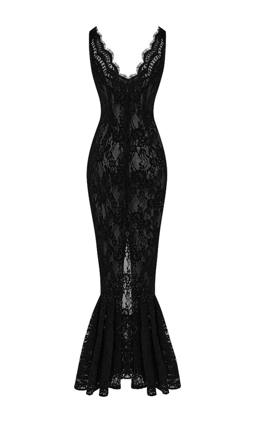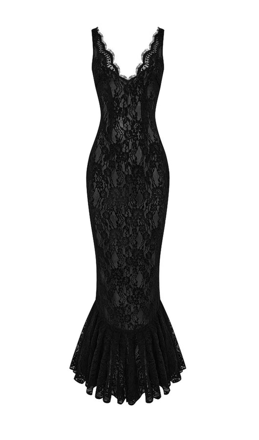 V Neck Lace Hollow Out Ruffled Maxi Dress