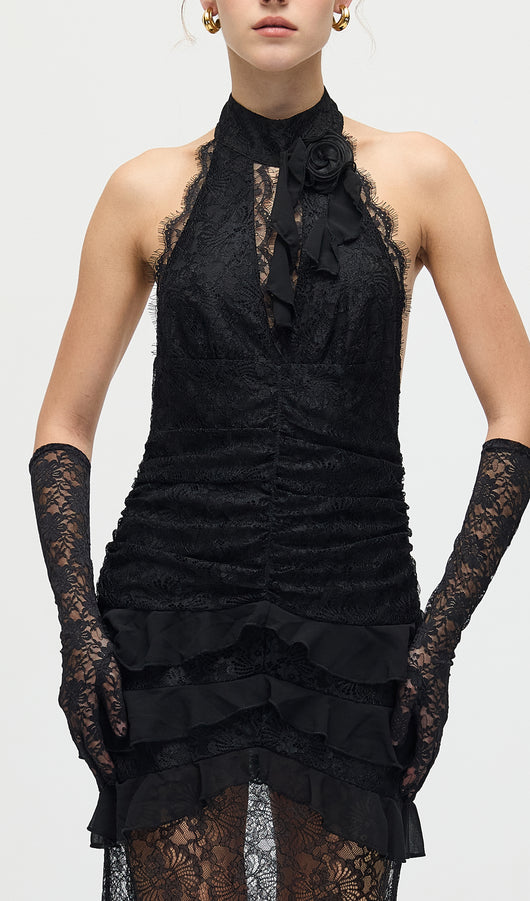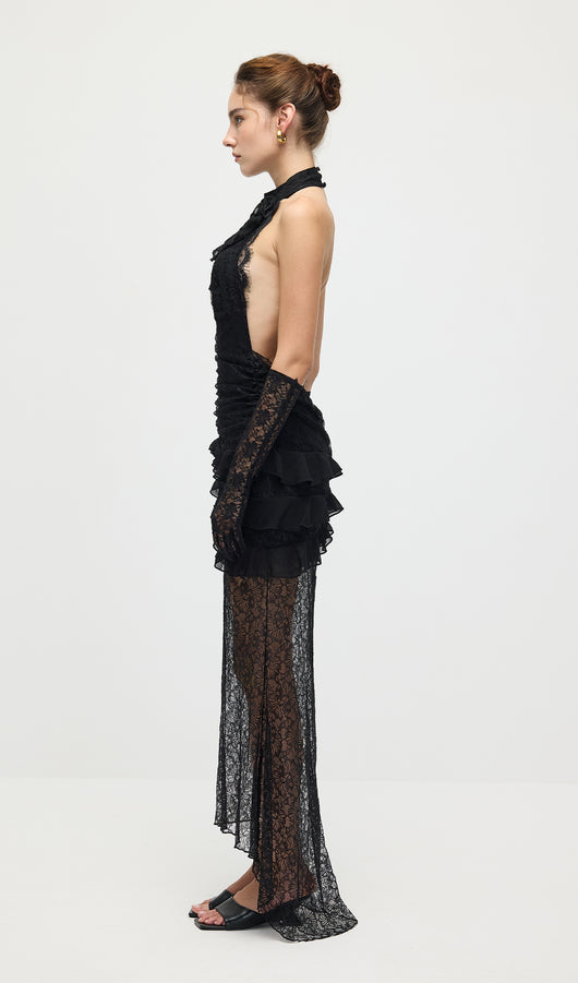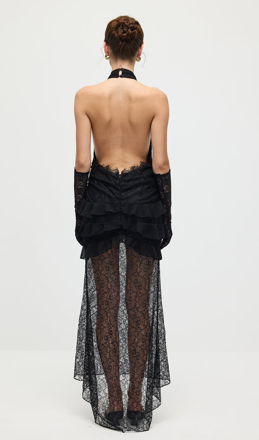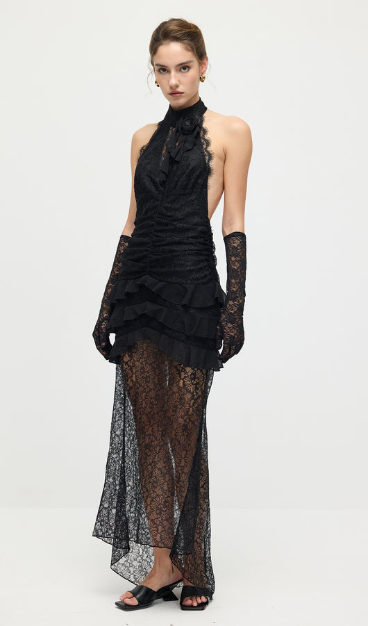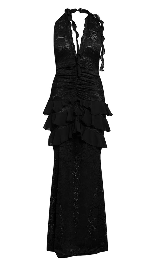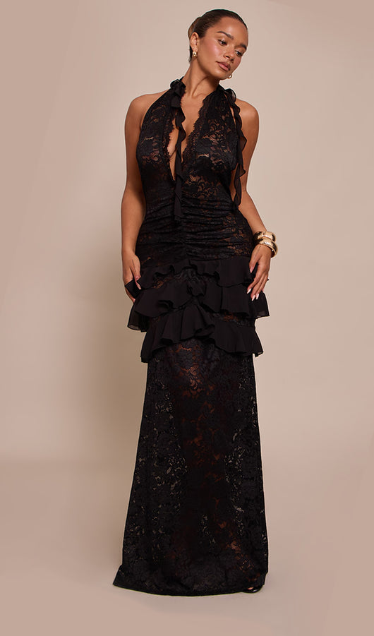 Turn heads in the shape black lace plunge neckline frill detail maxi dress. Made from a black lace material, it features a plunge neckline, frill detailing, and a floor-sweeping maxi length for a dramatic finish. Style with heels and statement jewellery for evening glamour.