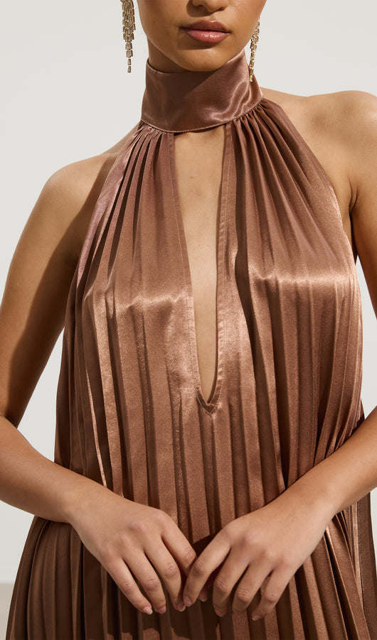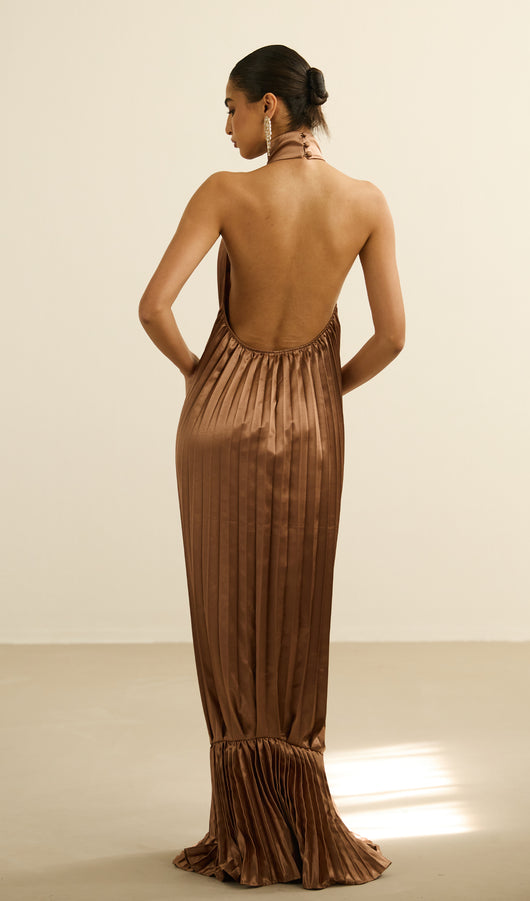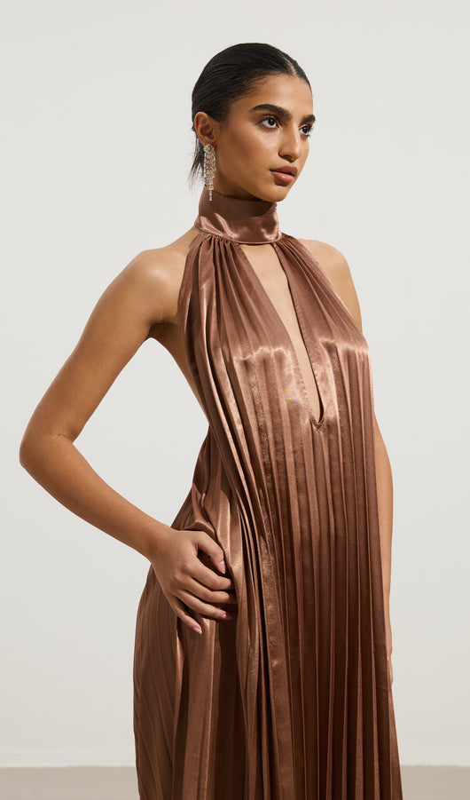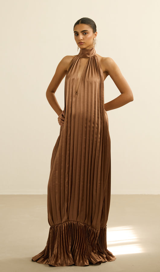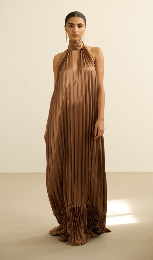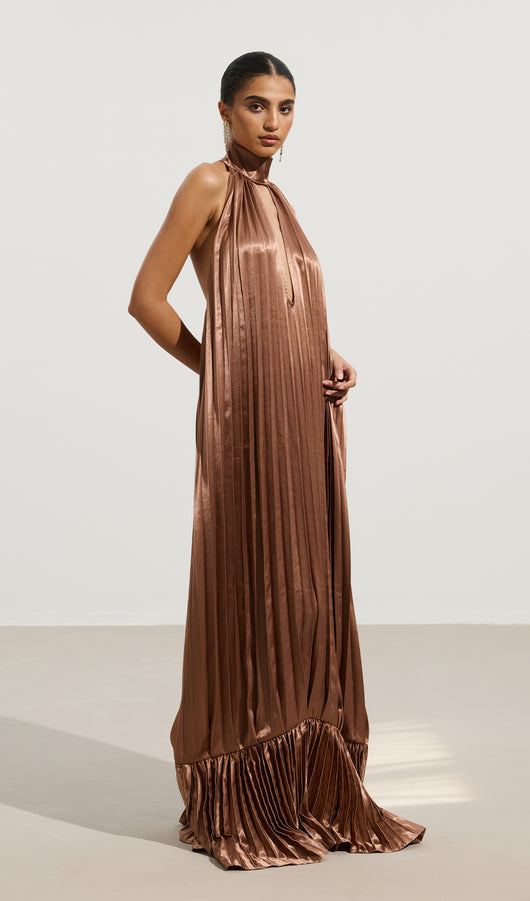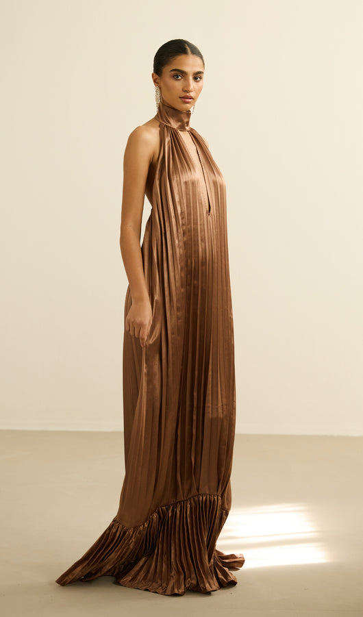 This maxi dress features a sophisticated V neckline complemented by delicate pleats that add texture and flow to its silhouette. The ruffled trims enhance its elegance, creating a graceful movement with every step. Crafted for both style and comfort, this dress is an excellent choice for formal occasions or refined evening wear.