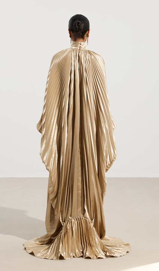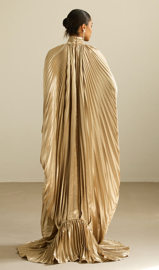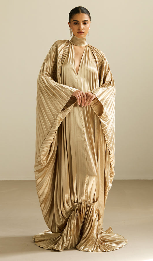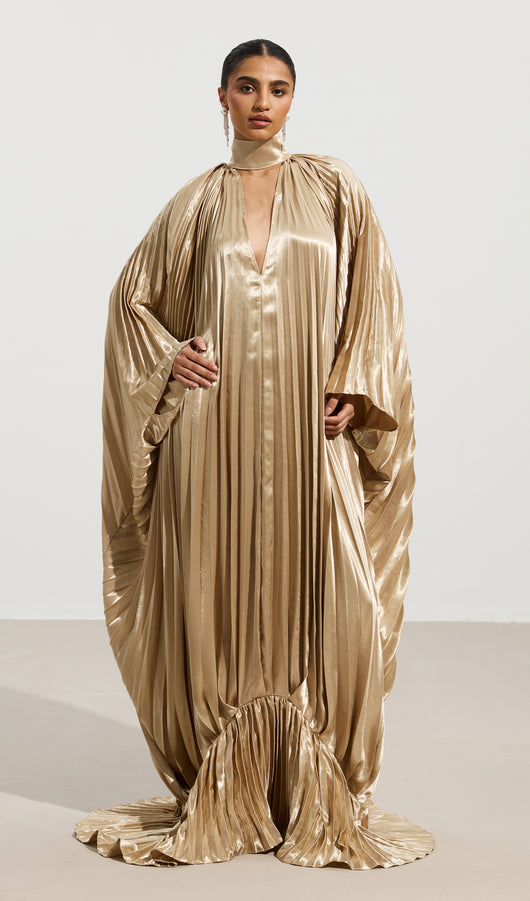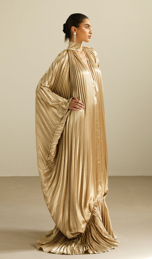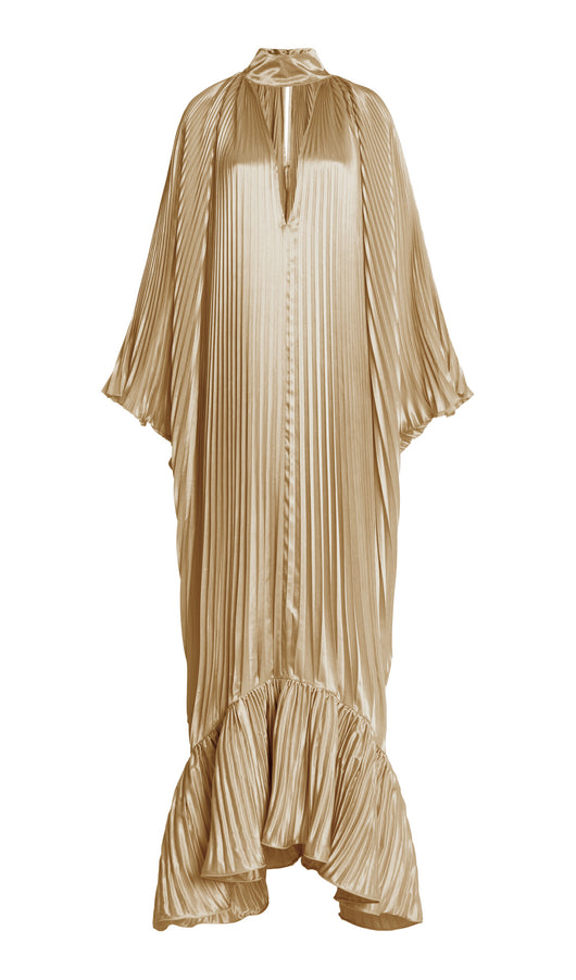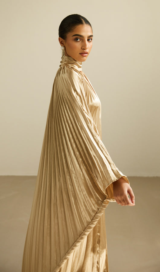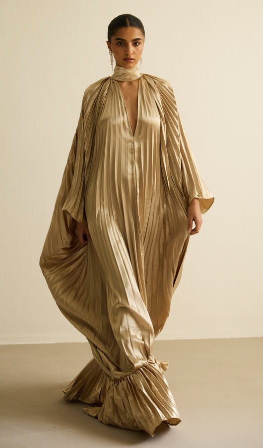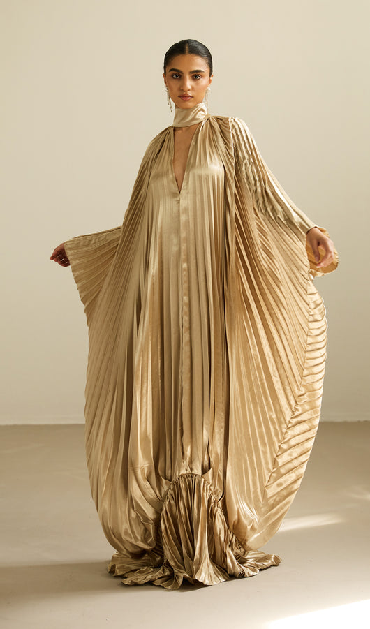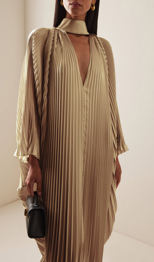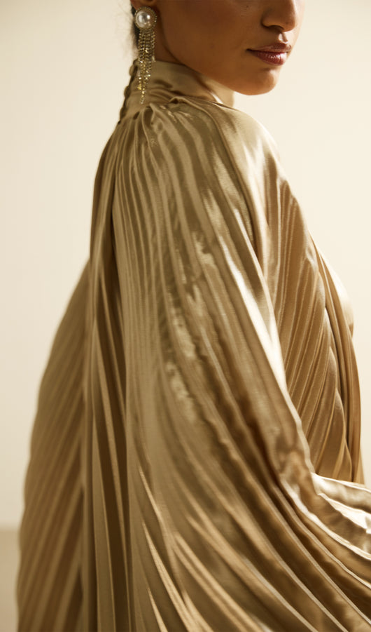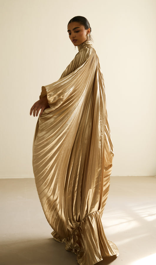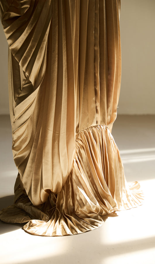 V Neckline Pleats Ruffled Maxi Dress In Gold