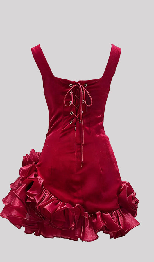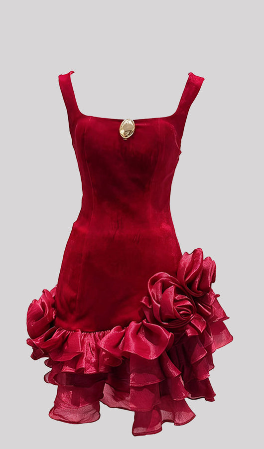 Elevate your evening wardrobe with the Velvet Tiered Ruffle Mini Dress in Red. Crafted from luxurious velvet, this dress features delicately layered ruffles that create a dynamic silhouette and soft movement. Its mini length and vibrant red hue make it an ideal choice for making a confident, stylish statement at special occasions or night events. Designed to blend elegance with playful charm, this dress offers both sophistication and flair.