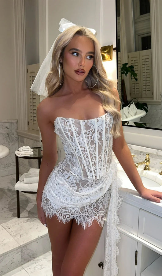 Seductive fitted mini dress made from delicate lace with a strapless corset bodice and a straight skirt, finished with a spectacular asymmetric drapery.