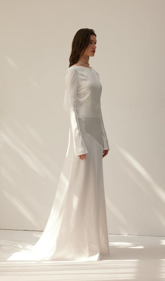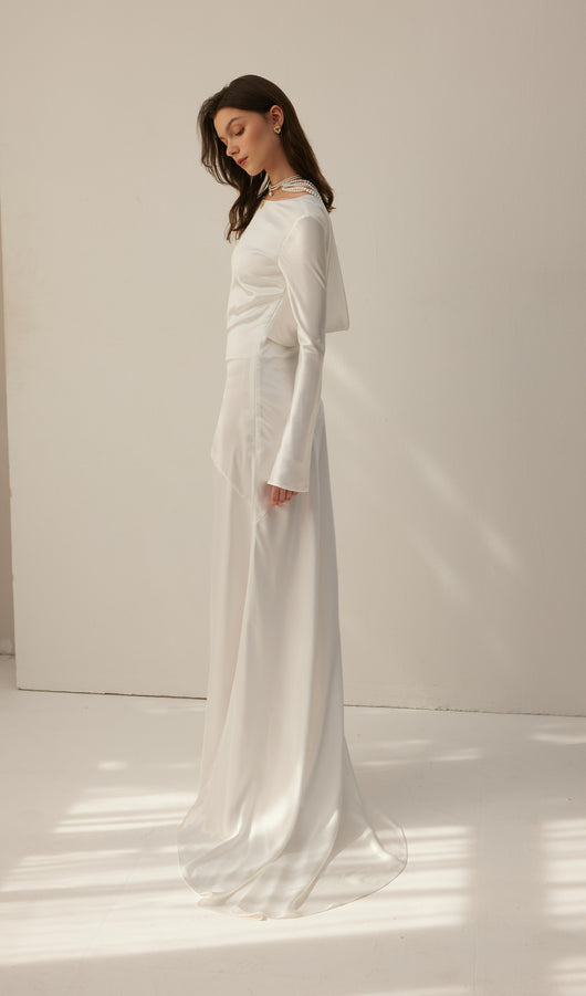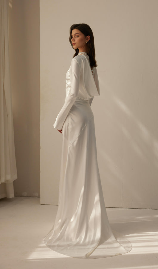 Step into a dream with the Eden Gown in luminous ivory white. This floor-length dress is made from Oeko-Tex certified 50% Ecovero 50% viscose satin, offering you a truly opulent look. The bias cut drapes beautifully on the body. A show-stopping wide open cowl back infuses the design with modern allure, while flowing bell sleeves and a sweeping train add touches of romance. This gown promises to make your special moments unforgettable.