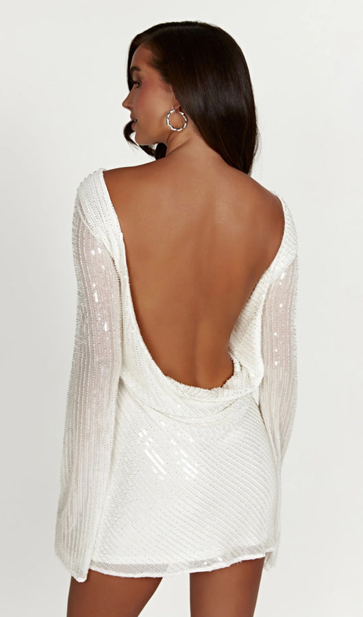The White Sequin Mini Dress was designed to be the perfect second-dress for dance-floor-loving brides. It has been crafted from our custom sequined and beaded fabrication that shines bright in the light. The back features a low cowl to give it extra drama. Wear with Heels to complete the look.Its unique combination of sequins and beads creates a dazzling effect that catches the light with every movement. Beyond the glamour, this white sequin mini dress is designed with comfort in mind—perfect for a night of dancing without compromising on style. The lightweight, breathable fabric allows for ease of movement, making it ideal for energetic celebrations. Whether it's an after-party or a reception under the stars, this mini dress is your go-to for creating a lasting impression.